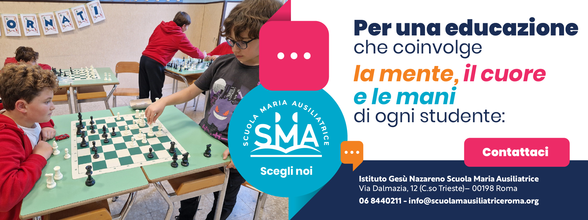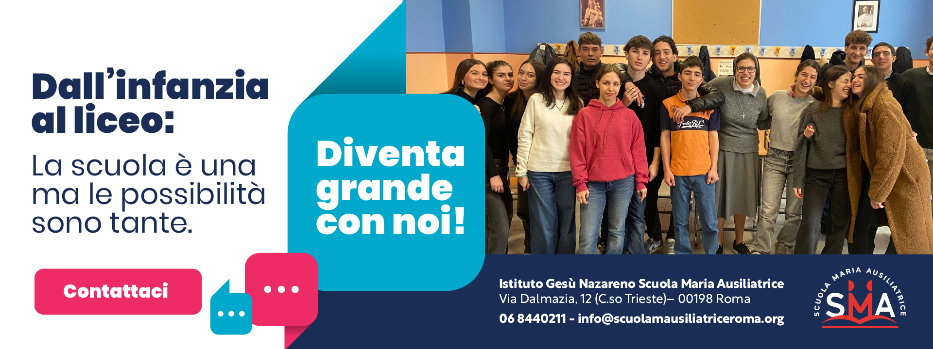 Scuola Maria Ausiliatrice, situata nel cuore di Roma, è una paritaria salesiana che offre percorsi dall’Infanzia al Liceo. Con l’attenzione alla persona, la didattica innovativa e i valori di Don Bosco, accompagniamo bambini e ragazzi verso il pieno successo scolastico .